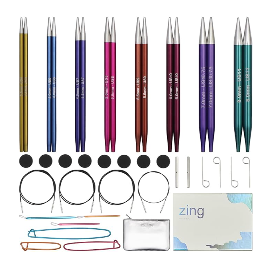 Set of 8 sizes of Zing Interchangeable Circular Needles. Aluminum needles. Includes 4 fixed cables, 8 end caps, cable connectors, wool nedles, and more. This will quickly become your go-to needle kit for projects of all sizes..